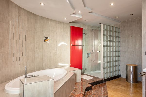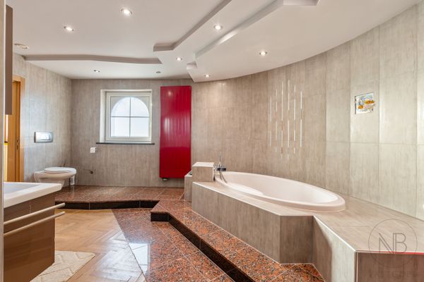 De verdieping heeft drie volwaardige slaapkamers. De grootste slaapkamer heeft een dressing en rechtstreekse toegang tot de badkamer. Deze is comfortabel ingericht met een dubbele wastafel, een inloopdouche, ligbad en toilet.