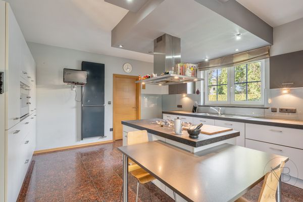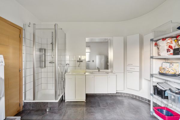 Bij het binnenkomen van de woning komt u via de inkomhal in een royale leefruimte met warme parketvloer en een gezellige gashaard. Aansluitend is er de volledig ingerichte keuken, afgewerkt met natuursteen en uitgerust met een gasvuur, wat zowel functionaliteit als uitstraling biedt. Naast de keuken is er een berging met inbouwkasten, een wasplaats (met douche) en een apart gastentoilet.