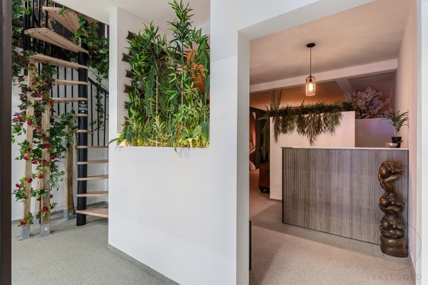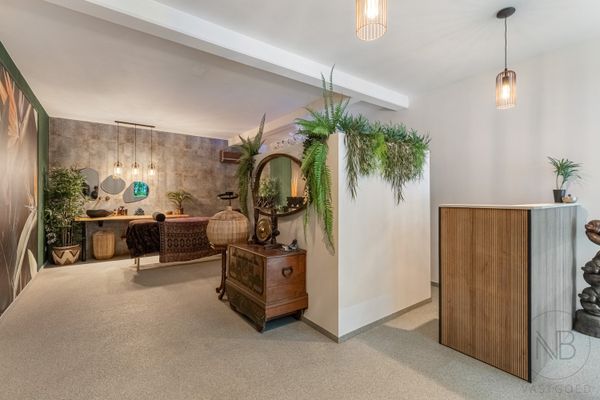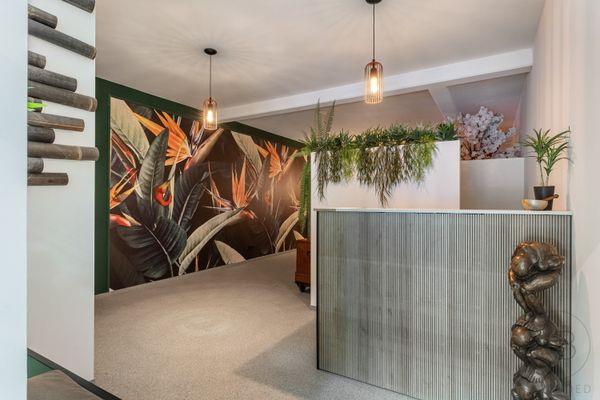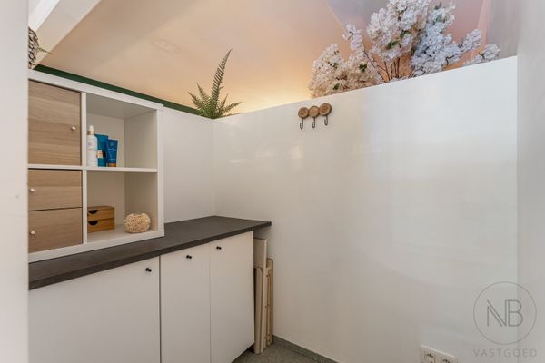 - Op het gelijkvloers is gekozen voor lichte, zachte beige tinten, wat zorgt voor een rustgevende en uitnodigende uitstraling – ideaal voor beauty, wellness of een praktijkruimte.