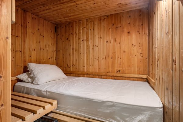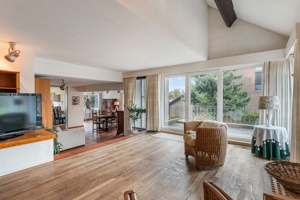 Het duplex appartement heeft een inkomhal met vestiairekasten en een lichte woonkamer die is opgedeeld in een eetgedeelte en een hoger gelegen zitruimte met kachel. De grote raampartijen zorgen voor een aangename lichtinval. De open keuken sluit aan bij de eetruimte en beschikt over een handige wasplaats.