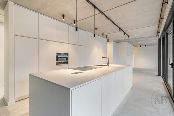 Via de lift of trap bereik je de private inkomhal, die toegang biedt tot de verschillende ruimtes van het appartement. Vanuit de inkomhal kom je in de zithoek, die naadloos overloopt in de open keuken. Grote raampartijen zorgen voor een aangename lichtinval en geven toegang tot het ruime terras. Het appartement wordt verhuurd inclusief verlichting en gordijnen.