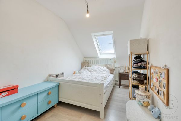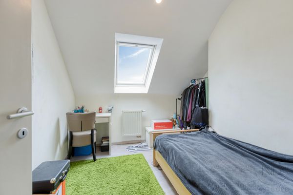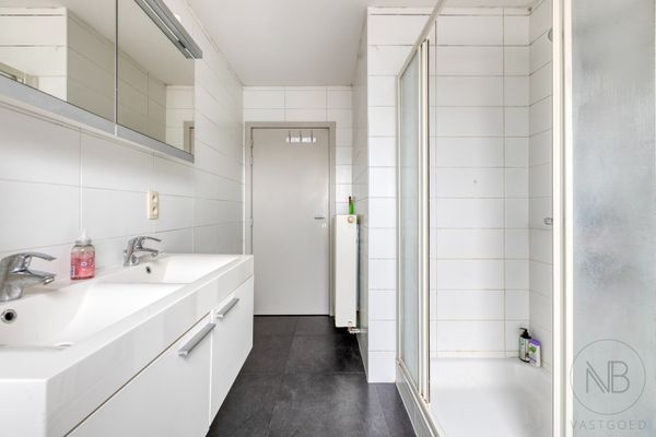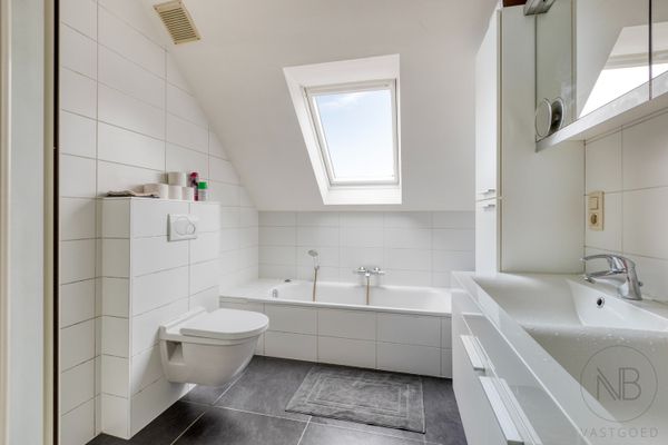 Op de bovenverdieping telt het appartement drie volwaardige slaapkamers en een ruime badkamer, uitgerust met dubbele lavabo, toilet, ligbad en douche. Ideaal voor gezinnen of wie graag extra ruimte heeft.