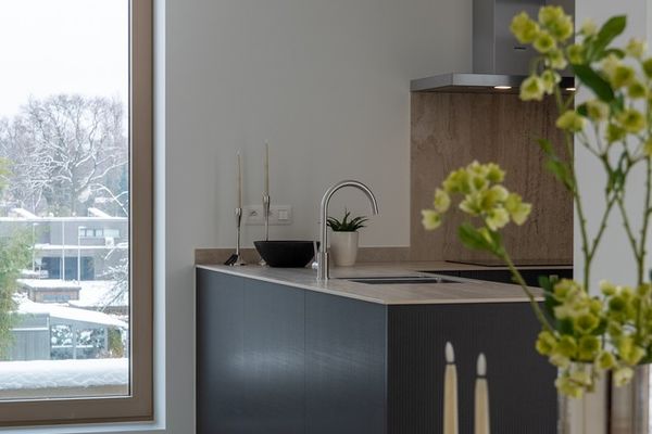 Vloerverwarming ondersteund door een lucht water warmtepomp, waardoor ook koeling mogelijk is.