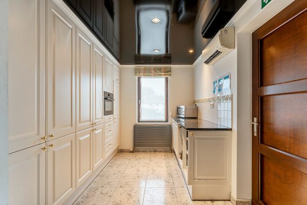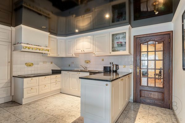 Aan de linkerzijde van het gebouw is er een aparte ingang voor het bovenliggende woongedeelte. Via de inkomhal leidt een trap naar een ruime hal op de eerste verdieping . De woonst heeft vier slaapkamers, een gemoedelijke leefruimte met haard, een ingerichte keuken, een badkamer met ligbad, toilet en dubbele wastafel, nog een apart toilet en een overdekt terras, perfect om in alle seizoenen van de buitenruimte te genieten. Het terras is ook bereikbaar via een buitentrap.