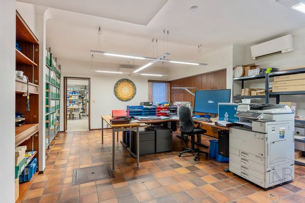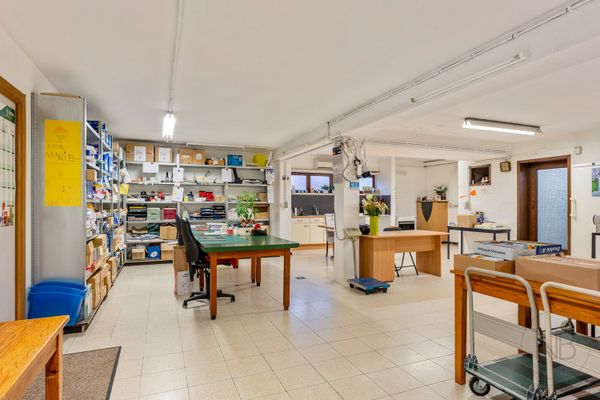 Het kantoorgedeelte heeft een aparte inkom en omvat een voormalige winkelruimte, een toilet, 2 afzonderlijke kantoren, een groot kantoor met keuken en bergruimte, en aansluitend een magazijn. Daarnaast is er een inpandige garage voor twee wagens. De voormalige winkelruimte en de garage zijn momenteel ingericht als woongedeelte, wat extra flexibiliteit biedt in gebruik.