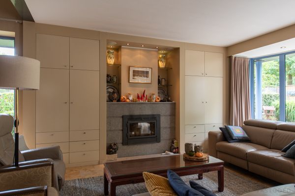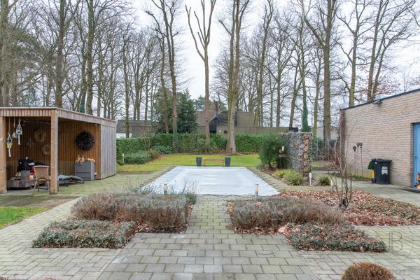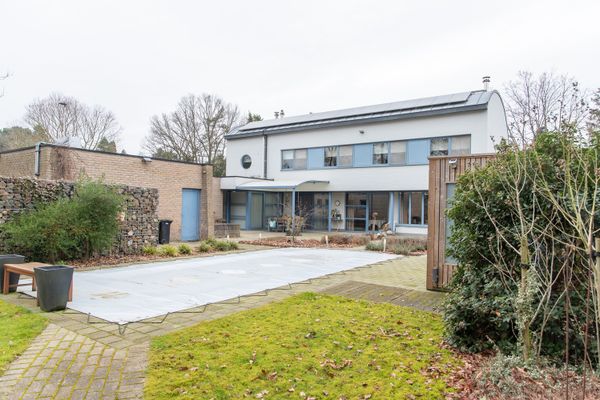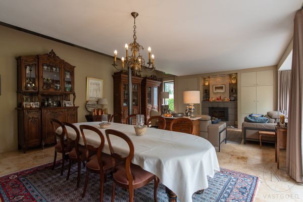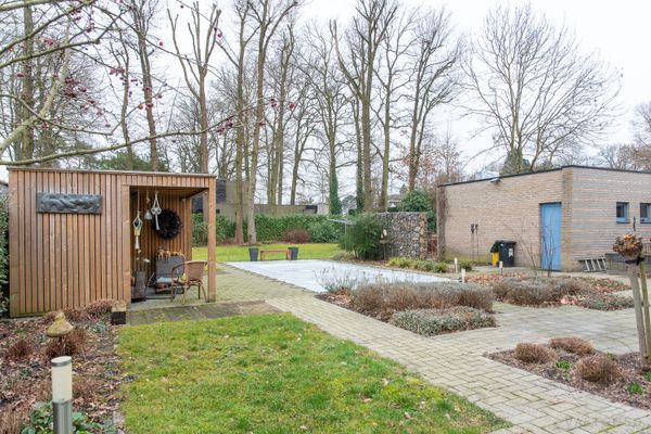 De woning heeft een unieke L-vormige indeling, waarbij alle leefruimtes uitkijken op de zonnige, zuidgerichte tuin. Op het gelijkvloers is er een apart bureel naast de inkomhal- ideaal voor thuiswwerk. De ruime leefruimte is ingericht met een eethoek en een gezellige zithoek met ingebouwde haard en maatwerk kasten. De open leefkeuken is recent vernieuwd en biedt eveneens plaats aan een eethoek en zitruimte. Aansluitend is er een praktische bijkeuken met wasvoorzieningen en directe toegang tot de dubbele garage en de tuin. De tuin is zuidelijk georiënteerd, heeft een groot, deels overdekt, terras, een verwarmd zwembad en 2 tuinhuizen.