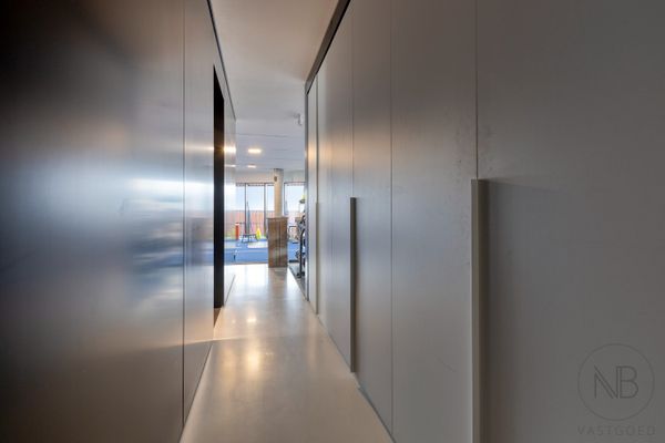 Het pand is volledig afgewerkt met een strakke witte gietvloer, wat zorgt voor een frisse en tijdloze look. Daarnaast zijn er twee praktische nissen aanwezig die voorzien zijn van ingebouwde kasten, ideaal voor extra opbergruimte en een nette inrichting van de werkplek.